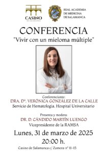 Esta tarde en el casino de Salamanca, a las 8 de la tarde, la Dra Verónica González de la Calle, hematóloga del Hospital Universitario de Salamanca y vicepresidenta de Real Academia de Medicina de Salamanca, hablará sobre el Mieloma Mútiple