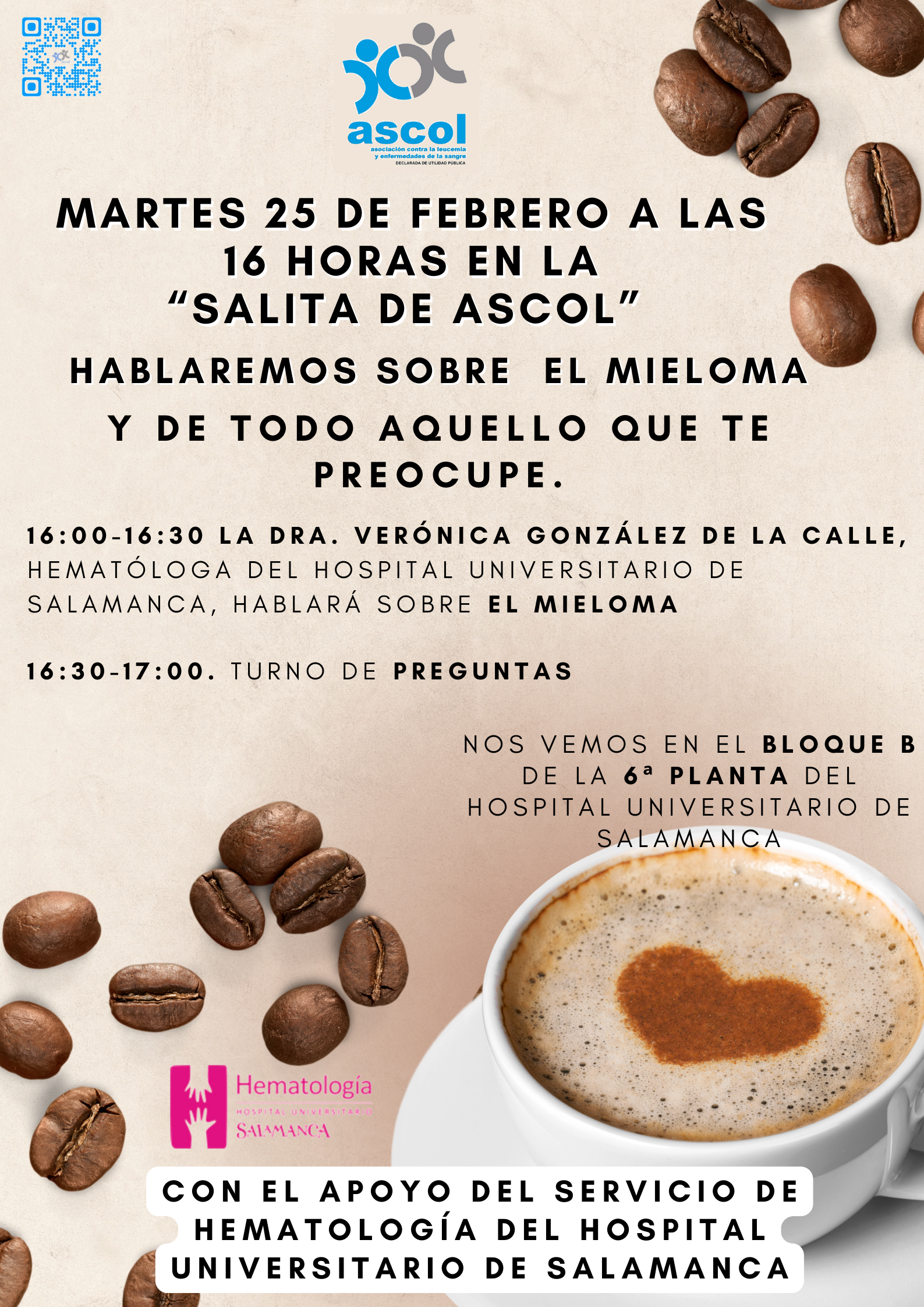 Será presencial en la salita de ASCOL que está en el Hospital Universitario de Salamanca, Bloque B, planta 6ª